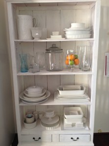 Old brown wood shelving unit updated to house my white crockery