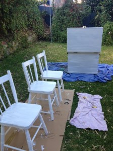 • A top coat (For the cupboards: we asked the store for the one they recommended. We got the Aqua Enamel and were able to tint it any colour we chose. For the coloured chairs: I just got sample pots of outdoor paint and had it tinted in a range of pastel colours. I also purchased a gloss finishing coat which I never used. If I was going to paint outside furniture I definitely would apply this coat. [I am going to do a bench soon will use this then.])
